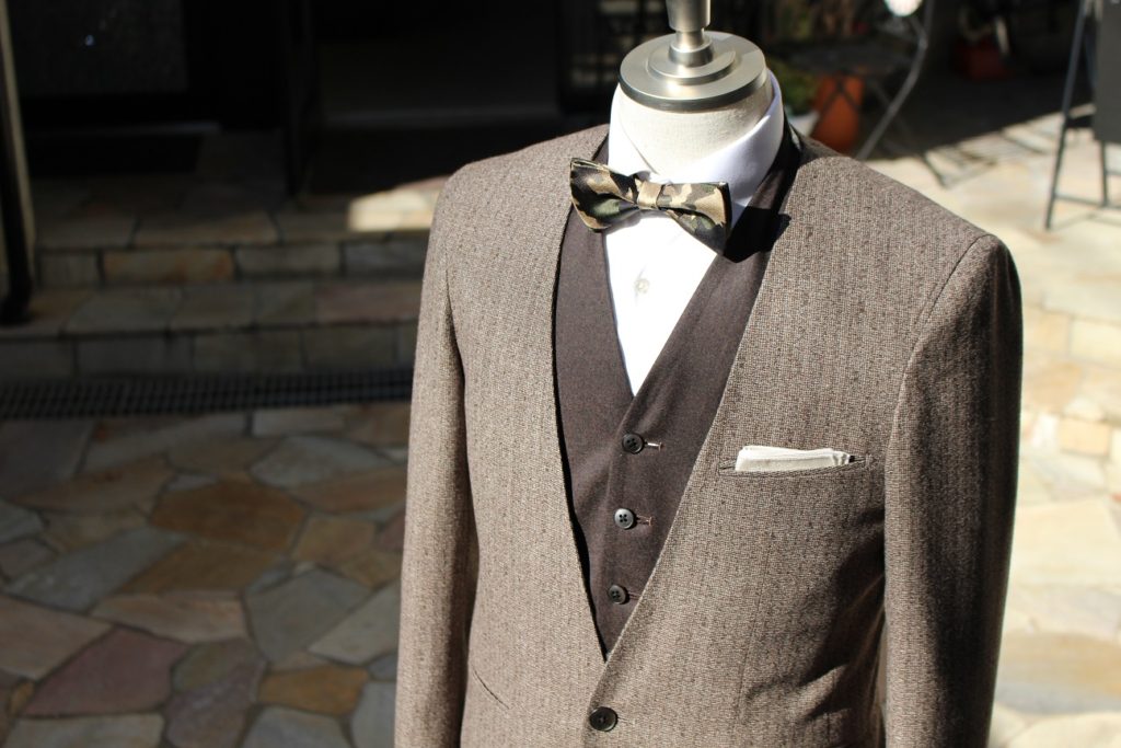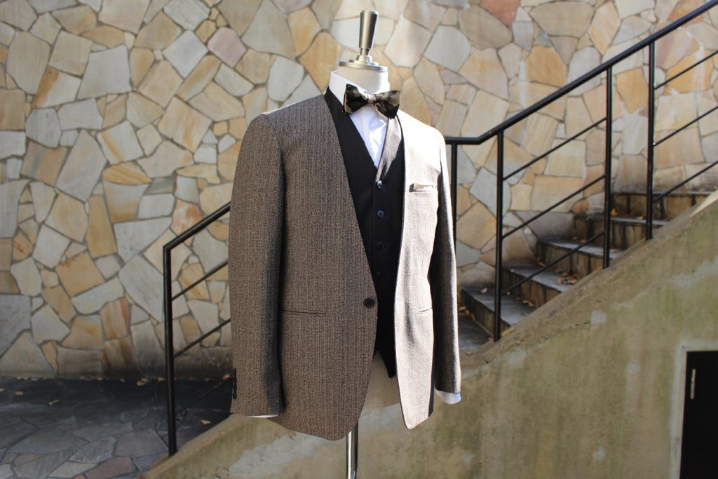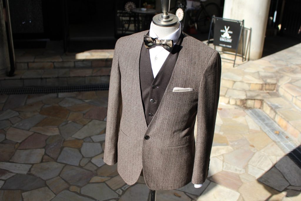 特殊なジャケットデザイン。可愛らしいスーツスタイルウェディング。